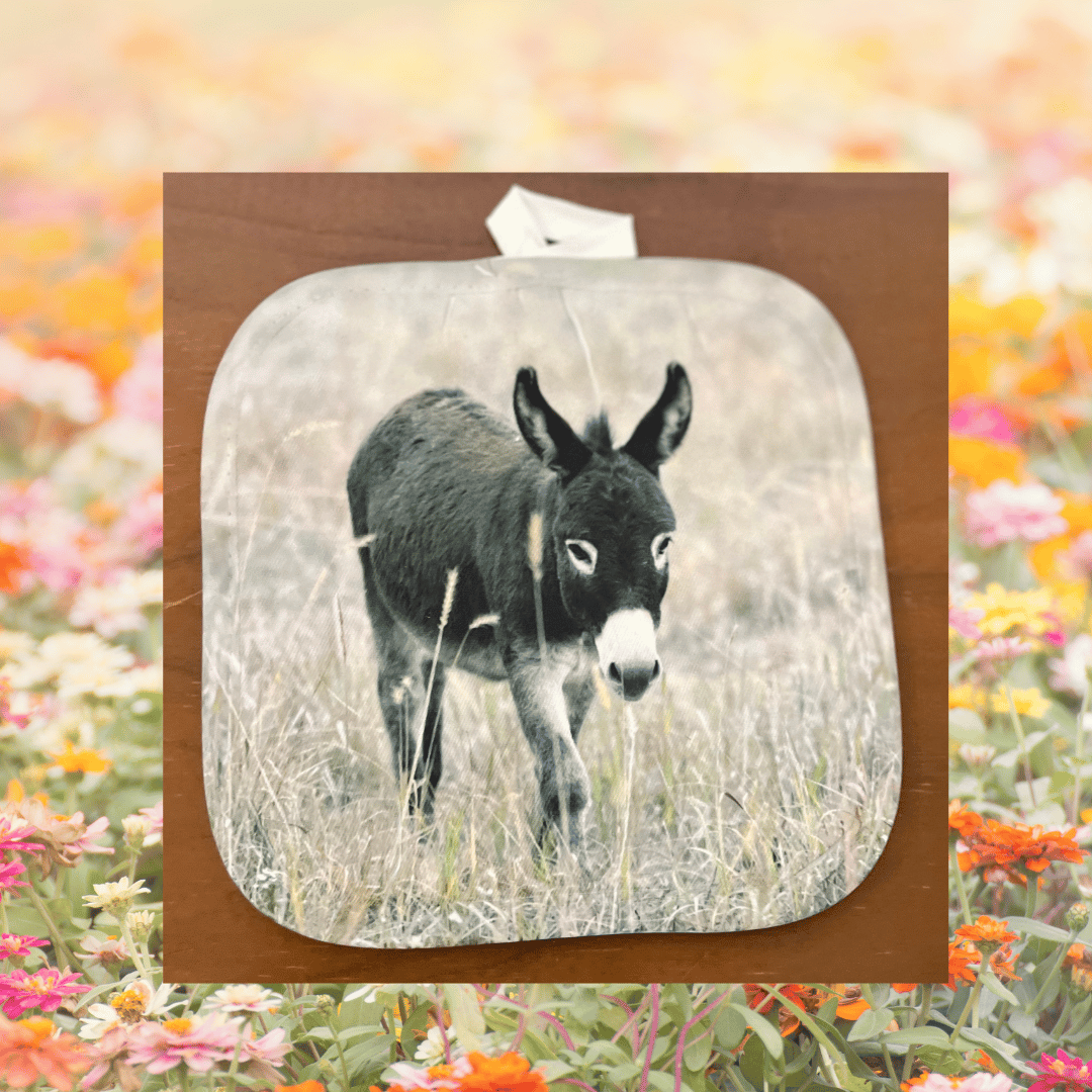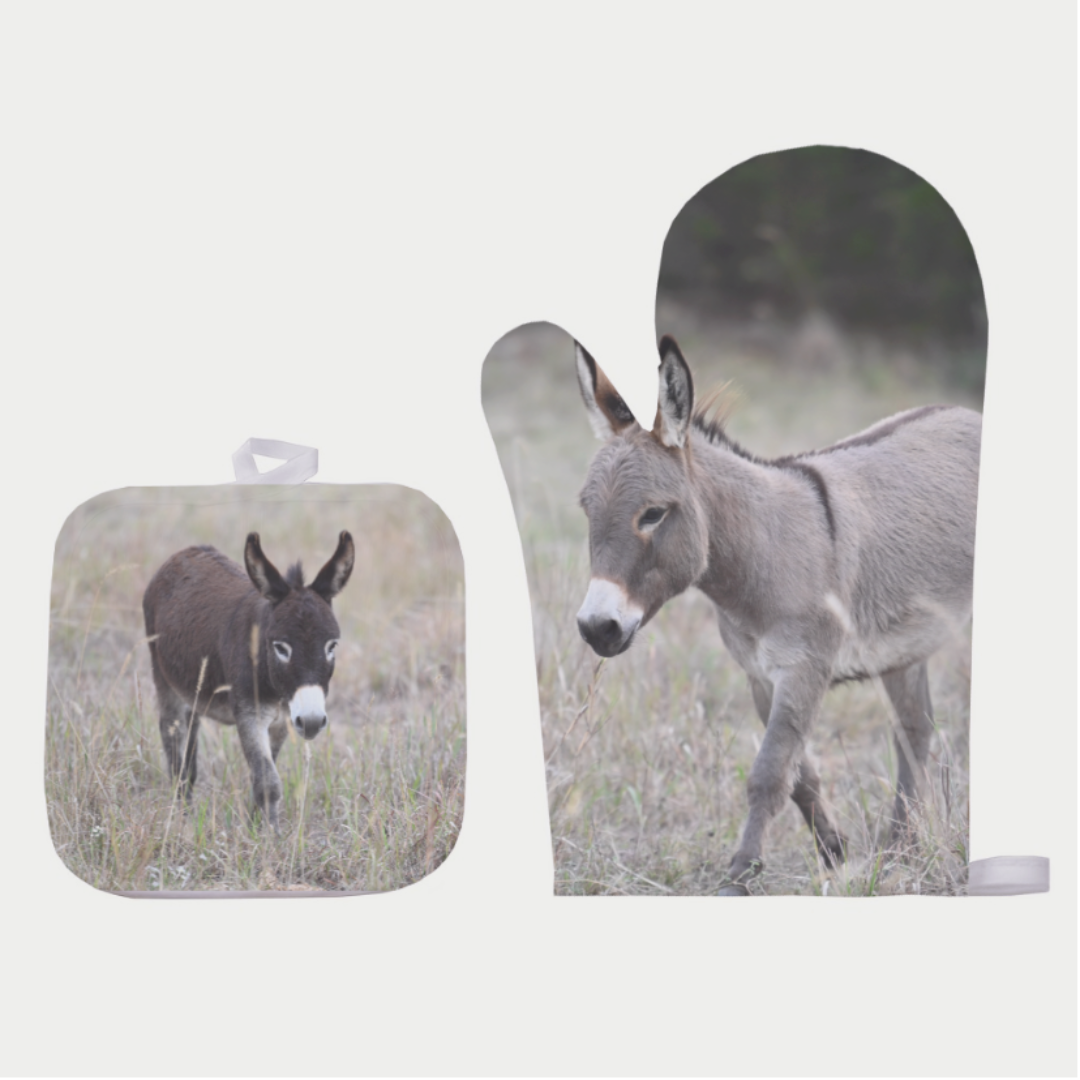 Shop now and bring a smile to your kitchen with our Mini Donkey Pot Holder and Oven Mitt set!