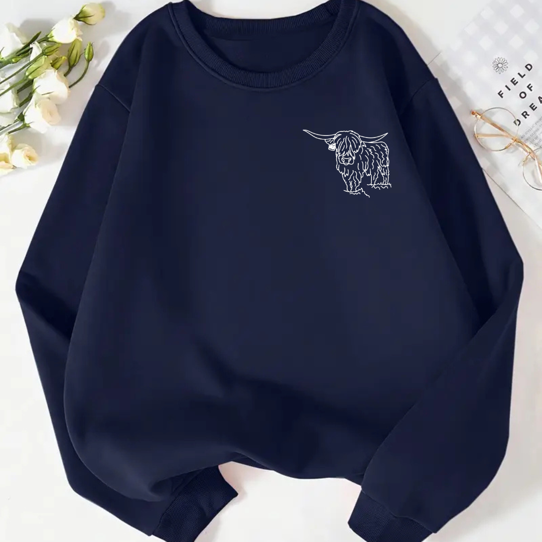 The charming Highland Cow design brings a touch of rustic, ranch-inspired flair to your wardrobe, while the premium-quality materials make it ideal for layering or wearing solo. Whether you’re relaxing at home or heading out for errands, this sweatshirt is your go-to for effortless style and comfort.